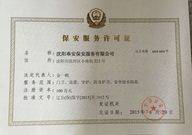 沈陽奉安保安服務有限公司(原沈陽市沈河區(qū)保安服務公司)創(chuàng)建于一九八八年八月,是遼寧省公安廳、沈陽市公安局批準,工商行政部門登記注冊,全市首家具備保安資質(zhì)的特殊性服務企業(yè),隸屬于沈陽市沈河區(qū)政府直管的全民國有企業(yè),現(xiàn)為中國保安協(xié)會會員單位和省保協(xié)、市保協(xié)常務理事單位:在全市同行業(yè)中率先通過ISO國際質(zhì)量認證,是市工商局批準的“重合同守信用”免檢單位和沈陽市政府采購中心保安服務項目重點競標單位;擁有一支專業(yè)化、標準化、職業(yè)化的高素質(zhì)保安隊伍,是公安機關重要的輔警力量。